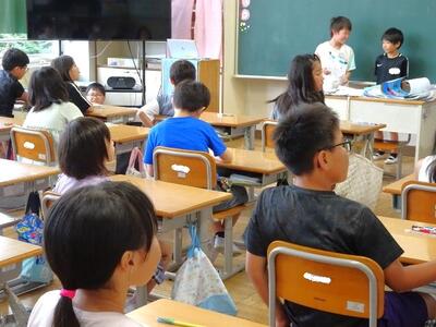 【5年生】5年生の教室にだれもいなかったので、探してみたら学習室に集まって真剣に話を聞いているところでした。海浜自然の家への宿泊学習が迫っています。今日は、全体で決まりなどについて知りました。