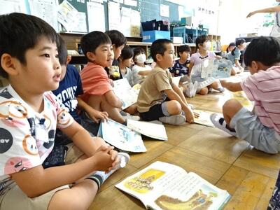 【1年生】1枚目の写真は、国語の「こえをあわせてよもう」の学習の様子です。みんなで「おむすぶころりん」のお話しを確認してから、グループに分かれて群読しました。