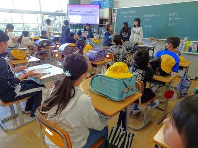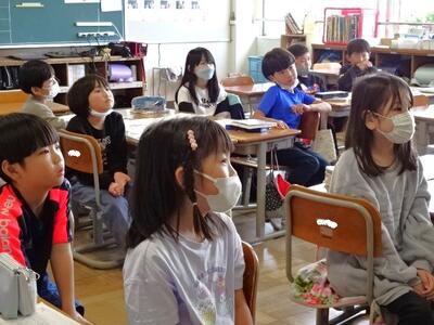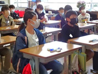 【4・5・6・7組】大型提示装置に学習の映像を流しています。集中しています。