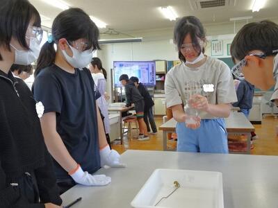 【6年生】1枚目の写真は、理科の「ヒトや動物の体」の学習の様子です。今日は、食べ物に含まれているデンプンは、だ液によってどのように変化するのかを実験しました。