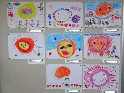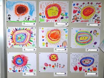 1年生の図画工作「どんどんかくのは たのしいな」の「わたしのおひさま」の作品です。今、教室の廊下側に掲示されています。