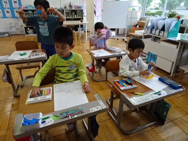 【1年生】1枚目の写真は、算数の「おなじかずのなかまをさがそう」の学習の様子です。この単元の学習も、いよいよ「10」の構成に入りました。10は、いくつといくつか、〇を塗りながら調べていました。