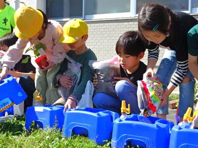 【4・5・6・7組】1枚目の写真は、花に水をやっている様子です。植物も生き物です。大切にしてくれてありがとう。