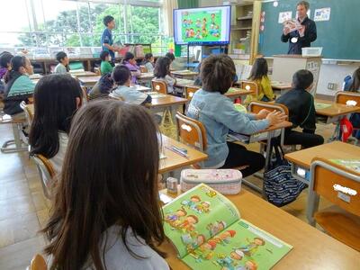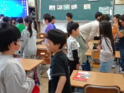 【3年生】1枚目の写真は、外国語活動の時間の様子です。今日は、いろいろな国の「じゃんけん」の掛け声を学習しました。韓国や中国のじゃんけんの掛け声を確認しながら、じゃんけんに挑戦しました。