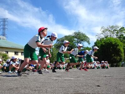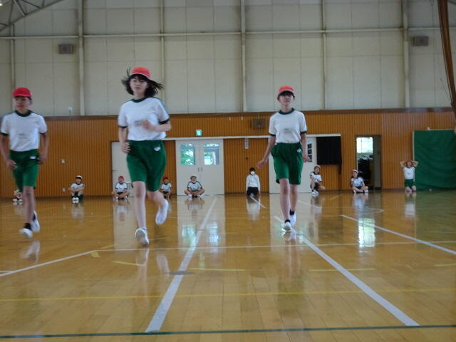 【1年生】1枚目の写真は、新体力テストの「シャトルラン」の練習をしている様子です。1年生は、5年生がお手伝いをしてくれています。一緒に走る微笑ましい光景です。