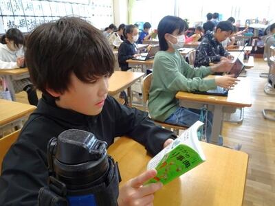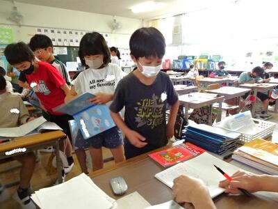 【2年生】1枚目の写真は、図書室で本を借りている様子です。来週のすきま読書に備えて、違う本に挑戦します。