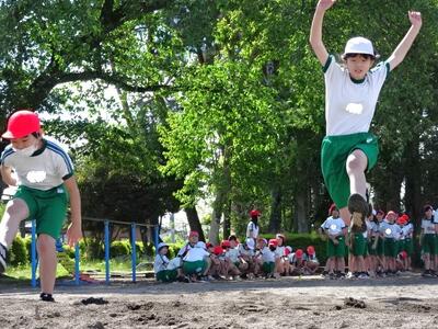【6年生】1枚目の写真は、体育の「走り幅跳び」の活動の様子です。今日に合わせて用務員の先生が耕運機で砂を柔らかくしてくれていました。みんなふかふかの砂をめがけて、しっかりと着地していました。