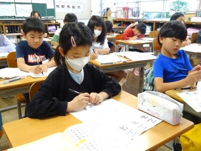 【3年生】1枚目の写真は、書写の時間の様子です。新聞紙で何かを作っていますね。もうすぐ毛筆が本格的に始まるので、練習した作品をはさんでおく用具を作っています。