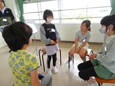 【2年生】1枚目の写真は、音楽の時間の様子です。教室の右と左に分かれて「山びこごっこ」や「かくれんぼ」の唄を歌いながら、楽しく活動していました。