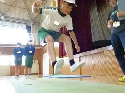 【5年生】今日は1年生と同じく新体力テストです。1枚目の写真は、1年生に手本を見せている様子です。1年生の面倒をしっかりと見てくれました。立派な上級生です。