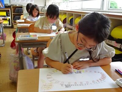【1年生】1枚目の写真は、図画工作の時間に遠足の思い出を描いている様子です。動物とふれあっていたり、乗り物に乗っている様子を楽しく表現していました。