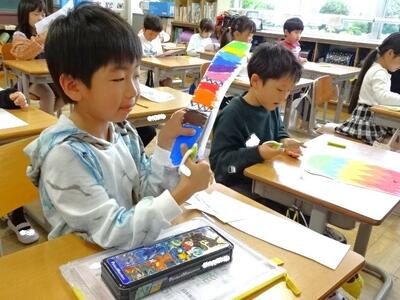 【2年生】1枚目の写真は、図画工作の「ふしぎなたまご」の学習の様子です。不思議なたまごを半分に切って、生まれた物と一緒に台紙に貼っていきます。仕上がりが楽しみです。