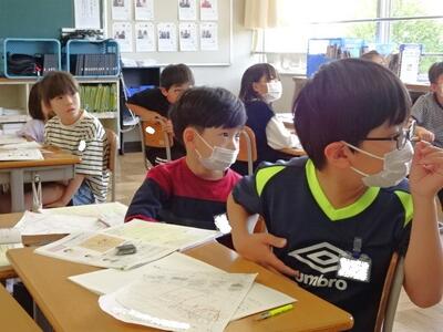 【3年生】1枚目の写真は、社会科の「学校のまわりはどんなようすなの」の学習の様子です。先日の学校周辺の調査を、写真を見ながら思いだし、ワークシートにまとめていきました。