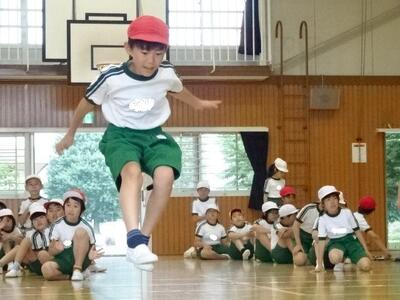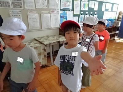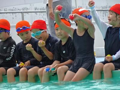 【2年生】1枚目の写真、すっごい喜んでいる場面です。実は、2つのチームに分かれて、プールの中のゴムボールなどを拾う競争をしていたのです。10点や5点のものもあり、自然と計算もできるシステムです。