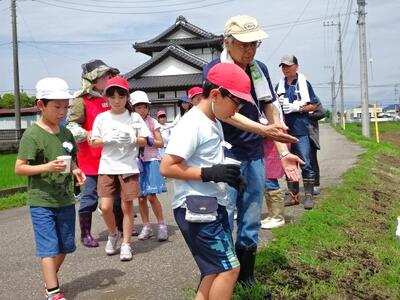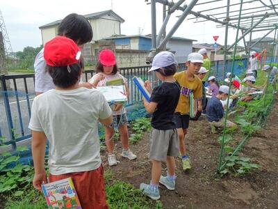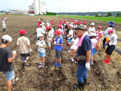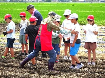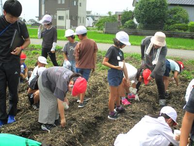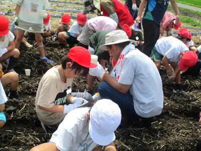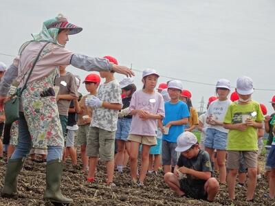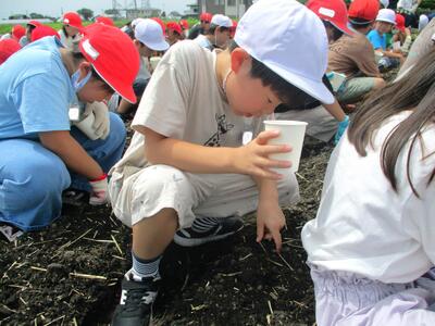 【3年生】3年生の総合的な学習の時間の活動の一環で、大豆の種まきを実施しました。1枚目の写真は、ボランティアの皆さんに教わりながら、一粒一粒を丁寧にまきはじめる様子です。