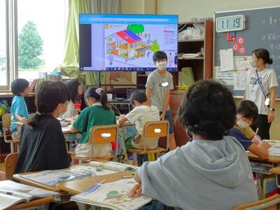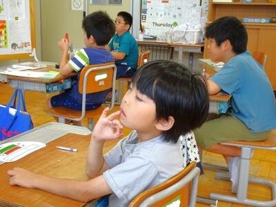 【4年生】1枚目の写真は、外国語活動の時間の一コマです。今日は、「I like ~」の学習で、好きな曜日を伝え合います。ALTの先生と単二の先生のやりとりが、子どもたちにとって手本となります。