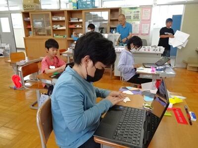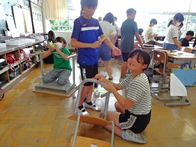 【5年生】1枚目の写真は、図画工作の「あんなところがこんなところに」の学習の様子です。教室内の空間を、配置をかえたり飾り付けたりして、いつもと違う空間に変えていきます。