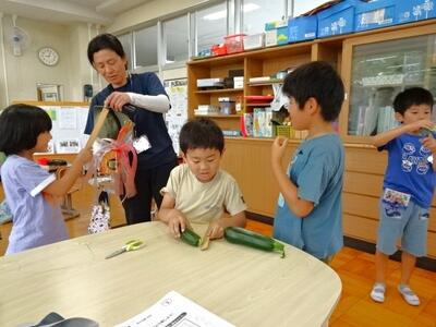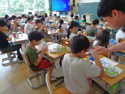 【3年生】1枚目の写真は、「空きようきのへんしん」の学習の様子です。ペットボトルや牛乳空き箱などの材料に、自分の設計図通りにカラー粘土を貼り付けてデザインしていきます。