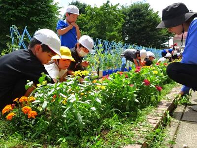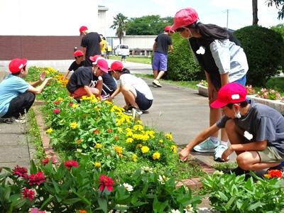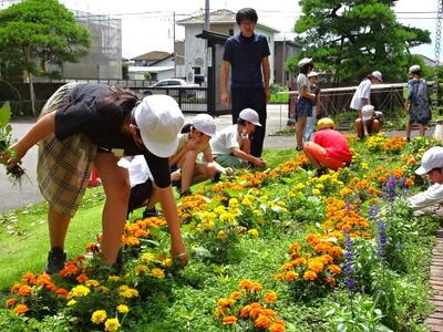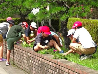 6月24日(月)のかみまつタイムは「緑化活動」でした。上松山小学校は、緑がいっぱいの学校で、草もたくさんはえています。この日は、学級の花壇の除草をしたり、学年の分担場所の草むしりや枝拾いを行いました。
