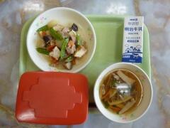 今日も野菜たっぷりのメニューでした。さわにわんは豚の脂身とせん切りにした野菜で作った塩味の汁物ということで、ちょっと京風な感じの中に隠し味のコショウがきいていて、あっさりながらもとても味のあるお汁でした。メインのあつあげのみそには、野菜たっぷりの中に柔らかい厚揚げとお肉が味噌味でよくまとまっていてとても美味しく、お腹もいっぱいになりました。今日もとても清々しい天気で、お腹いっぱいになると・・・睡魔に負けずに午後も頑張ります(^_^)/