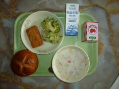 さて、今日はお待ちかねの「お話しメニュー」の日です。栄養士に今日のコンセプトを聞いてみました。「今日はクリスマスのお話し〈パンダのポンポン クリスマス あったかスープ〉より、あったかスープです。サンタにごちそうを作って待っていたコックさんのパンダ(ポンポン)はクリスマスにやってきたトナカイのためにスープを作りました。じゃがいも、にんじん、たまねぎ、ミルクの入ったあったかスープです。今日は6年生の育てた大根を加えて、ほくほくのあったかスープに仕上げました。」コメントどおりのスープでした。(寒~いのちょっち冷えて、あったかは控えめで失礼しました。)