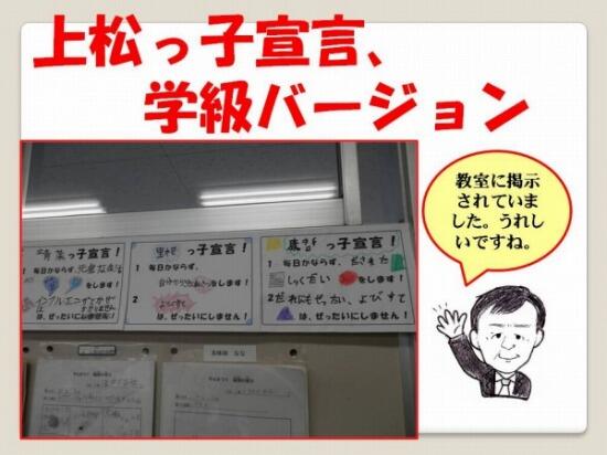 本年度4月から進めている「上松っ子宣言」ですが、日常の学年・学級でに実践化が大切と思っています。今日6年生の帰りの会に参加していたら、宣言を暗唱していました。一つのことを為し得るには継続が必要です。3年生の教室の掲示に学級バージョンの宣言が掲示されていました。深化という領域と思っています。「やってはならぬ やらねばならぬ ならぬことは ならぬものです」~今年度はこれをくり返します(*^_^*)