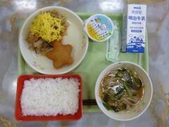 さて、本日のメニューは七夕シリーズです。オリジナルな「たなばた汁」もあります。では解説しましょう。(1)たなばた汁は、具のオクラとそうめんがポイントです。オクラはよく見ると星形です。そうめんはおりひめの糸をイメージしました。 (2)ほしのコロッケは見てのとおりです。 (3)七夕ゼリーは開けて納得というものでした。七夕にちなんだそれぞれのメニューでしたが、五目ごはんも含めて738kcalの今月最高カロリーの給食を美味しくいただきました。