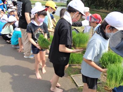 5年生の総合的な学習の時間の一つに「米作りに挑戦しよう」という単元があります。本校の東側は稲作が盛んであり、本校の特色ある行事にもなっています。この単元では、田植えから稲刈り、収穫後の食事までを体験することで、農業に携わる人々の苦労や喜びを味わいながら、お米についての理解を深めることを目的としています。今日は、しっかりと田植えを体験することができました。