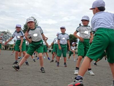 【1年生】1枚目の写真は、体育のプール活動の様子です。二人1組で、動きながら顔を水につける練習をしています。「あぎるのさんぽ ぶくぶくぱっ」という掛け声が響いていました。
