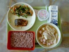 本日の給食は、入学・進級お祝いメニューです。お赤飯やすましじる、さくらゼリーと色鮮やかで、目でも舌でもおいしい給食を味わうことができ、全校生で1年生の入学と進級したことを喜びました。