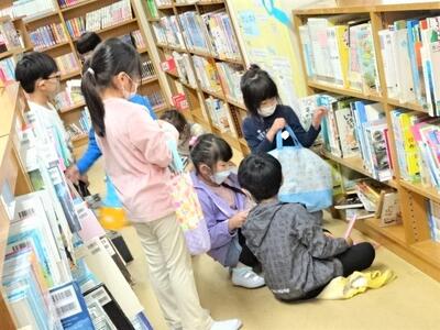 【1年生】1枚目の写真は、図書室で借りる本を選んでいる様子です。明日からの5日間の秋休みに備えて、図書室で本を借りました。図書室にはいろいろな本がたくさんあり、どの本にするかを迷いながら、真剣に選んでいました。本好きな子どもたちです。