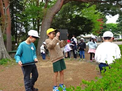 【4年生】1枚目と2枚目の写真は、理科の「春の生き物」の学習の様子です。今日は、タブレットを片手に春の生き物探しに出かけました。ふるさとの森や百年堀付近で生き物を探し回りました。
