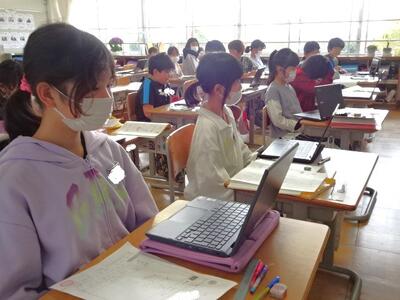 【5年生】1枚目の写真は、社会科の「世界から見た日本」の学習の様子です。今日は、世界地図を見ながら「経度と緯度」を学習しました。地図帳の活用のスキルがひとつ上達しました。