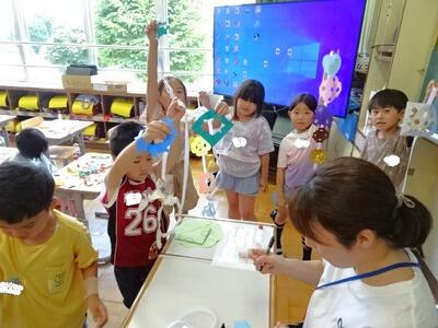 【2年生】1枚目の写真は、国語の「スイミー」の学習の様子です。今日は、大きな魚を追い払う作戦を立てている場面の学習です。たまたま赤いTシャツを着ていってしまったために、スイミーと同じ色だと騒ぎになってしまいました。ごめんなさい。