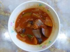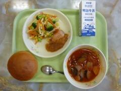 さて、本日のメニューの注目!「ラタトゥイユ」です。ラタトゥユ(フランス語: ratatouille)とはフランス南部プロヴァンス地方、ニースの野菜煮込み料理である。 玉ねぎ、ナス、ピーマン、ズッキーニといった夏野菜をにんにくとオリーブ油で炒めて、トマトを加えて香料で煮た料理です。今日はフランス風の家庭料理をいただいたわけです。給食も国際的です。鶏肉はバーべーキュー味で私には食べやすい仕様になっていました。花野菜にも夏を感じています。