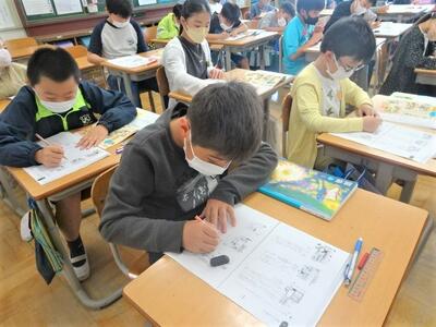 【3年生】1枚目の写真は、社会科の学校の周りの様子の散策してる様子です。学校の南西方面の散策です。帰ってきてからは、2枚目にあるようにすぐに白地図に見てきたことをまとめていきます。お店や住宅が多いことが分かりました。