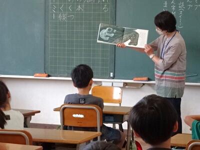 【3年生】1枚目の写真は、総合的な学習の時間の「学校のひみつ」の学習の様子です。今日は、地域や学校の歴史に詳しい方に来ていただき、当時の学校の様子や、生活の様子などについていろいろと話をしていただきました。
