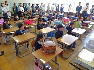 【1年生】今日は「入学式」です。84名の子どもたちが入学しました。しっかりとした態度で式に参加し、立派です。明日からの登校が楽しみです。