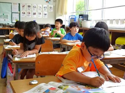 【1年生】1枚目の写真は、生活科の学習の様子です。「てづくりみずでっぽうであそぼう」という活動で、遊ぶための的や印をどんなふうに作るのか、一人一人できあがりの図を書いています。