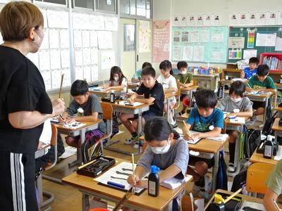 【3年生】今日は、書写の専門の先生にきていただく日です。1枚目と2枚目の写真は、先生に教わりながら「小筆」で自分の名前を書く練習をしている場面です。