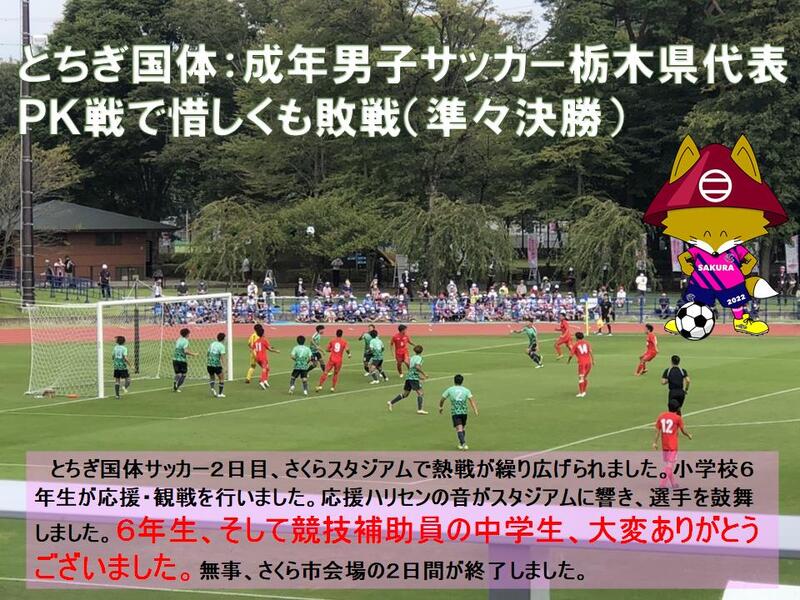 10月3日(月)にさくら市で「いちご一会とちぎ国体」の成年男子サッカーが行われました。本校児童(6年生)も、午後の試合の観戦に行きました。本校児童の観戦の様子は、4日(火)9時頃にアップする予定です。