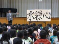全校集会が、体育館で行われました。体育館に入場する際も、無駄話もなく整然とできています。話を聞く態度も立派です。「わかりましたか。」の問いかけには、大きな声で「はい。」と素晴らしい反応もできています。私からは2つの話をしました。ひとつは、「水と緑と心の豊かな学校」をみんなでつくっていこうということ。もうひとつは、平野博文文部科学大臣からの、「新学期を迎えるみなさんへ」というメッセージについてです。羽吉先生からは、「用水路付近で遊んだり、いたずらをしない。」「連休中は、水の事故や交通事故に気をつける。」の2点についてのお話がありました。