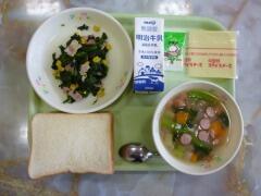 今日の予報は午後から雨となっています。寒暖の差があります。健康管理にはくれぐれもご注意を!と言っている自分が土曜日の奉仕作業後、発熱し週末は静養の2日間となりました。完治していないので今日の味覚は疑問符です。さて自分的に、今日の最大のミステリーは「ABCスープ」でした。栄養士に確認したところ、結構ポピュラー材料でアルファベットマカロニがあるんですね。スープの下にもぐり込んでいました。アイデア商品だと思います。セルフサンドはパンが1枚なので、薄くていいので2枚あるといいかな~と検食簿には記入しました。味覚疑問符ながら、それでもスープ・ソテー味はいいですね。でも、個人的ですが喉が痛~いです(>_<)
