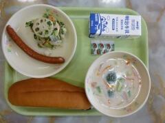 献立名:セルフホットドック (♡ソーセージ・ケチャップ) ♡牛乳 ♡☆れんこんサラダ ♡コーンとしろいんげんまめのポタージュ