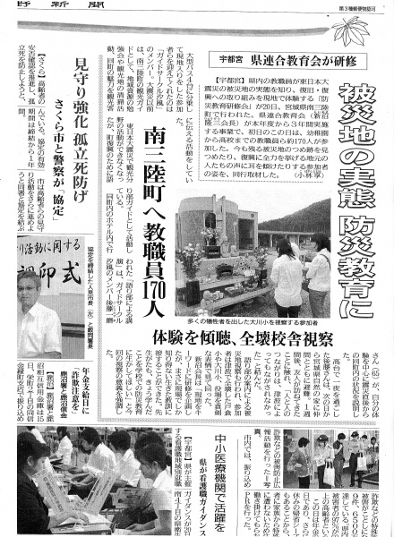 この研修は3班3日間にわたり実施されました。その様子が新聞に報道されています。現地をキーワードに、現場でしか知り得ない生きた教訓を学ぶということが主旨です。生きた研修として今後の学校教育に役立つものと思います。今日はメールでしたので、鮮明な写真をもとに直井教諭に月曜日に報告をしたいと思います。