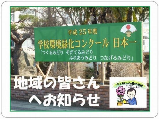 過日案内をした環境緑化コンクール特選受賞について上記のような看板を県道沿いに設置しました。学校の栄誉ある受賞の喜びを広く地域の皆様とともに共有したいと思います。この掲示板はしばらく設置と考えております。よろしくお願いします(^_^)v
