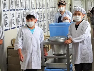 【5年生】1枚目の写真は、給食の準備のため、給食当番の児童が配膳室から給食を運んでいる様子です。教室をのぞくと、手洗いを終えた子どもたちが良い姿勢で座って待っています。もちろんおしゃべり等はありません。あまりの素晴らしさに、高学年らしい態度で給食前の手本であると声をかけてしまいました。