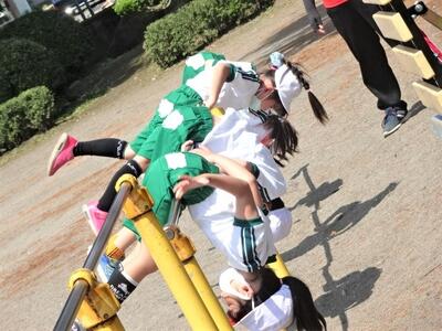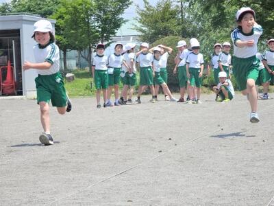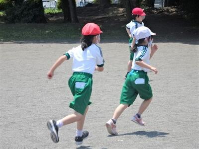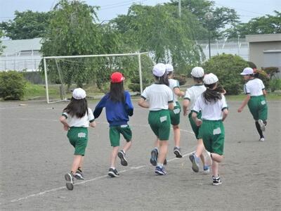 【1年生】今日は快晴。学校生活にも慣れた1年生は、今日も元気に運動に勤しんでいました。準備体操もだんだんと板についてきた感じがします。学習や運動に張り切っている姿が素晴らしいです。