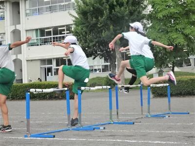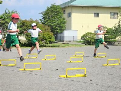 【3年生】1・2枚目の写真は、「小型ハードル走」という領域の学習です。やがて「ハードル走」につながる運動になります。いろいろな運動も、一年ごとに少しずつ難易度をあげていくのです。道具も進化しています。