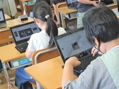 【5年生】1・2枚目の写真は、社会科の「さまざまな土地のくらし」の学習で、沖縄県について学習している場面です。まずは知っていることを調べてみたり、発表したりして、沖縄県についての興味関心を高めています。